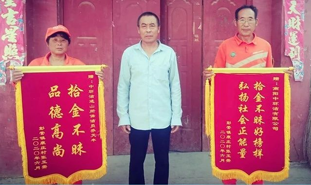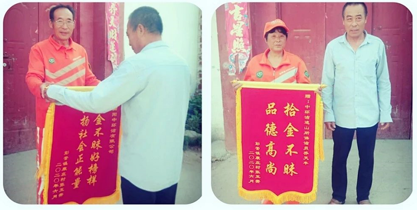 用專業(yè)守護(hù)環(huán)境,用真誠守護(hù)美好。近日,鎮(zhèn)平縣遮山鎮(zhèn)的一位村民帶著兩面分別印有“拾金不昧,品德高尚”、“拾金不昧好榜樣,弘揚(yáng)社會正能量”的錦旗到南陽中環(huán)潔遮山掃保所尋找環(huán)衛(wèi)工人喬天豐,要向他及南陽中環(huán)潔公司致謝。