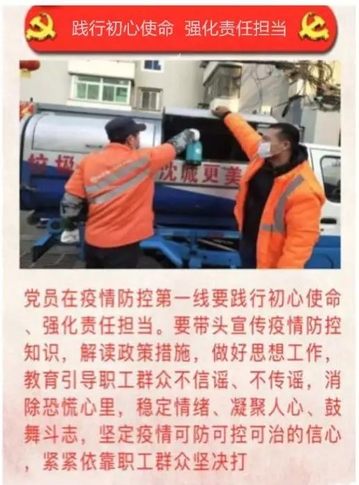中共中環(huán)潔(沈陽)城市環(huán)境服務(wù)有限公司黨委第一時間發(fā)起《致廣大黨員倡議書》,向廣大黨員傳達了黨中央的號召,吹響參加抗疫阻擊戰(zhàn)的集結(jié)號,下達了投身抗疫斗爭的動員令。